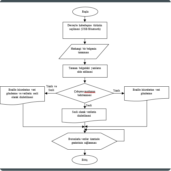 Geliştirilen cihazdaki işlem adımları aşağıdaki gibi sıralanabilir. İlk olarak devreyle haberleşme türünün seçilmesi gerekir. Haberleşme türü olarak USB ve Bluetooth tercih edilmiştir. Daha sonra tarayıcı aracılığıyla herhangi bir belgenin dış ortamdan alınabilmesi sağlanmıştır. Taranan belgedeki karakterlerin elde edilebilmesi için resim üzerinde bir takım görüntü işleme algoritmaları uygulanmıştır. Karakterlerin elde edilmesinin ardından cihazın hangi modda çalışacağı belirlenir. Eğer seslendirmeyle ilgili seçim yapıldıysa bilgisayar aracılığıyla zaten seslendirme yapılmaktadır. Eğer yazılı modla ilgili seçim yapıldıysa bilgisayardan devreye karakterler için belirlenen kodlamalar gönderilerek Braille hücrelerine aktarılıp görme engelli bireylerin elleriyle hissederek okuması sağlanmaktadır. Elde edilen metindeki karakter sayısı 96’dan fazla ise gezinti butonları kullanılarak tüm metin üzerinde gezinti sağlanabilmektedir.